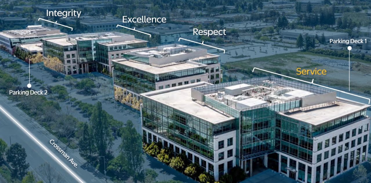 The Sunnyvale office is designed to be a vibrant part of the community – comprised of four office buildings (Service, Respect, Excellence, and Integrity) with amenity spaces, parking decks, and surface lots.